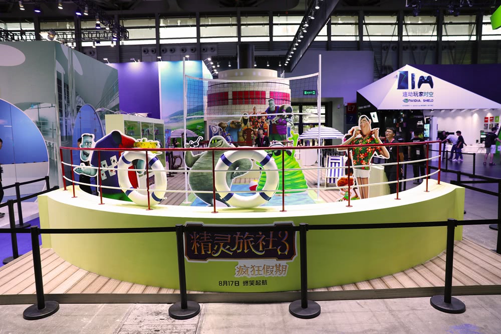 其中,《比得兔》主题展区各类衍生品激萌亮相,众多ShowGirl纷纷拿起毛绒绒的萌兔玩偶合影,相当养眼;《黑衣人》主题展台高度还原片中场景,未来感十足,两位手持光射**的“黑衣人”酷炫登场,更有主演汤米·李·琼斯和威尔·史密斯的模型惊喜坐镇。《精灵旅社》的主题展也以出现在第三部中的“豪华邮轮”华丽登场,德古拉家族集体出动搞怪卖萌,梅菲斯的蝙蝠装扮精致可爱,科学怪人、木乃伊、鼻涕虫等人气角色也一同亮亮相,抢眼造型再次圈粉无数。此外,现场还设置了“水上排球”等沉浸式互动体验区域,打造夏日清凉盛宴,3D泳池地贴带来前所未有的空间效果和感官冲击,成为现场的拍照打卡圣地,也有一些家长带着孩子前来参观体验。