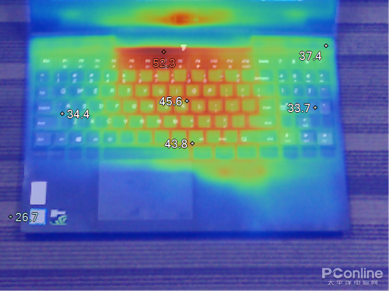 从图中我们可以看出来,C面的最高温度为52.3℃,接近于转轴的位置,键盘中部的平局温度在40℃以上,而玩游戏经常用到的WASD区域和小键盘区域的温度在35℃以下。