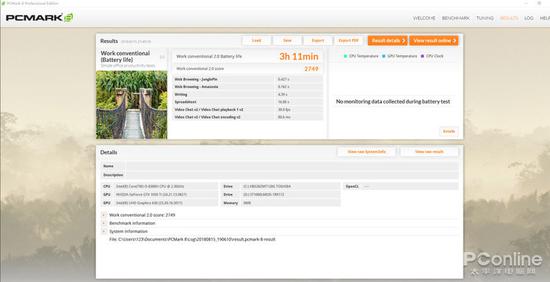 续航能力虽然不是游戏本优势,但是拯救者Y7000P的表现依然不错,在PCMark 8续航能力专项测试中,它的成绩3小时11分钟,这个成绩要高于一般游戏本。再搭配上它轻薄的身形,拿着拯救者Y7000P去出差也不失为一种不错的选择。