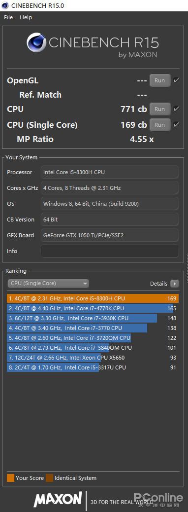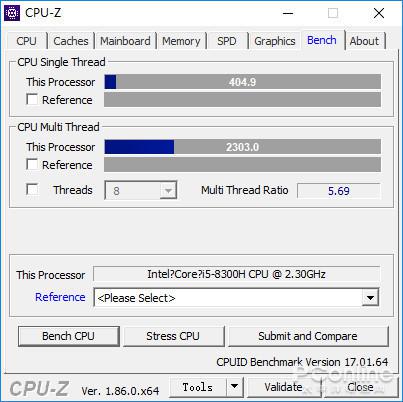 在处理器性能测试中,Intel Core i5-8300H在CPU-Z里的多核处理能力得分为2303分,单核处理能力得分为404.9分。在Cinebench R15测试中,它的多核处理能力得分为771cb,单核处理能力得分为169cb。从测试数据上来看,Intel Core i5-8300H的性能和第七代标压处理器Intel Core i7-7700HQ性能相近,处理器的整体性能不错。