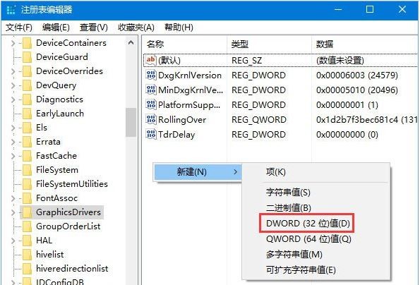 6、在打开的注册表编辑器窗口中,定位到HKEY_LOCAL_MACHINE\SYSTEM\CurrentControlSet\Control\GraphicsDrivers注册表项,在右侧窗口的空白位置点击右键,在弹出菜单中选择“新建/Dword(32位)值”菜单项。