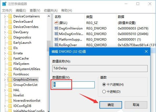 7、把刚刚新建的注册表键值重命名为TdrDelay,然后双击该注册表键值,在打开的编辑窗口中将其数值数据修改为8,最后点击确定按钮。重新启动计算机,再玩吃鸡游戏的时候,就不会再弹出上面的错误提示了。