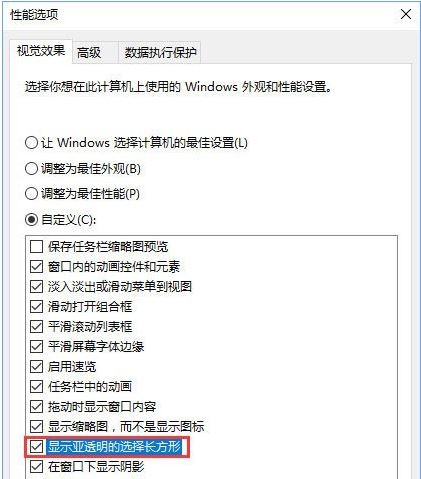 4、在打开的视觉效果窗口中找到并勾选“显示亚透明的选择长方形”,然后点击确定--确定保存设置即可;