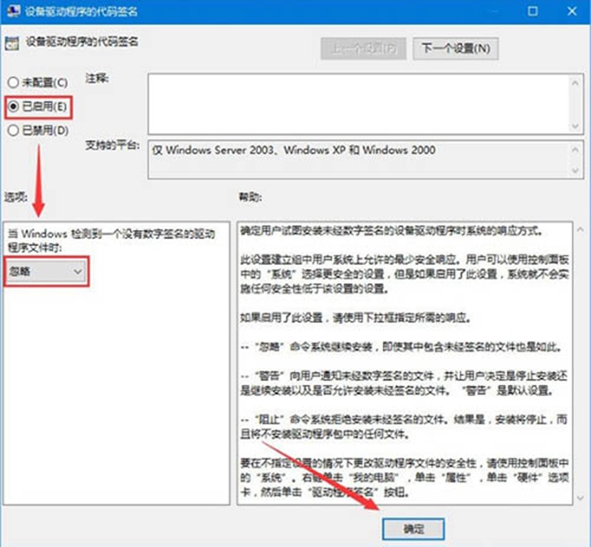 3、这时会打开该项的设置窗口,在这里选择“已启用”设置项,接着在下面的选项下拉菜单中,选择“忽略”菜单项,最后点击确定按钮;如图所示: