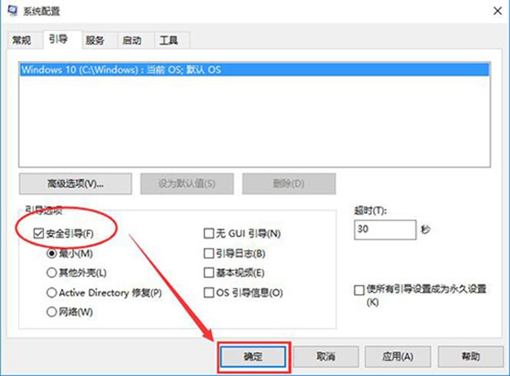 3、在引导选项卡窗口下,将引导选项下的安全引导(F)勾中,然后点击确定,如图所示: