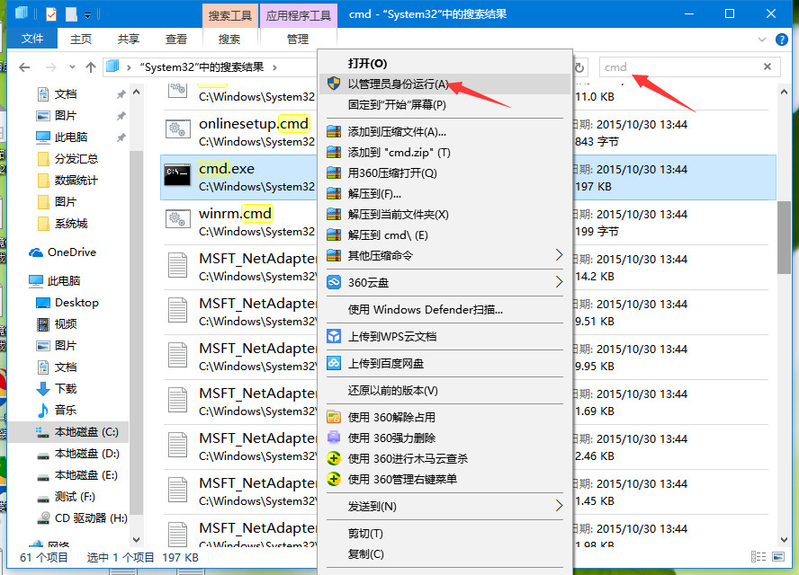 在C:\Windows\System32文件夹中搜索cmd,找到cmd.exe后右键,选择以管理员身份打开。