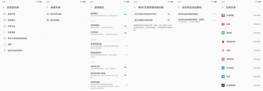 这些事实验室功能体感手势很新颖,左右转动手机就能快速打开开启相机,游戏模式各种优化选项能在游戏是提供更好的性能并进入消息免打扰模式。应用分身能多开应用使用不同账号,解决了经常切换账号的烦恼。聊天文章快捷切换功能好评,解决了看文章中回复消息找不回去的问题。还有例如贴近耳朵自动接听、录屏、位置穿越这些小功能,可以说非常贴心了。