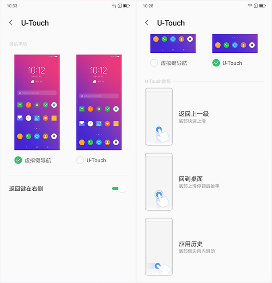 全面屏手势自然也不能少,分别是上划返回;上划停顿返回桌面;屏幕下方左右向内滑打开后台界面。使用下来感觉上划返回和停顿会桌面判定有点迷,经常想返回就退回到桌面,希望后续版本在优化一下手势体验。
