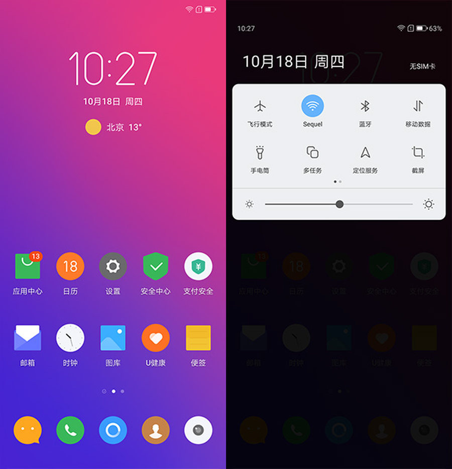 主界面美观简洁,使用当下流行的扁平化风格,下拉快捷栏功能丰富,可直接进行亮度调节。,刘海屏截图会自动补足”缺口“各位不用担心。系统开启后可在下滑后看到百分比电量。