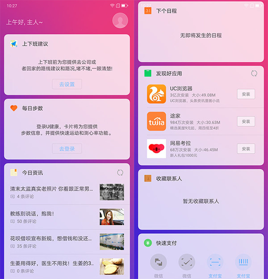 系统主界面右滑时负一屏功能,这里有上下班路程规划、每日步数、整合的今日资讯、接下来的日程安排、应用推荐、收藏联系人、以及快捷支付按键,每个模块都可以自定义隐藏或换位置,很方便。