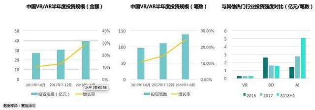 2018年1-6月中国VR/AR半年度投资规模39.2亿元,增长率为28.9%;共有投资138笔,增长率为24.3%。较之于AI等其他热门行业的投资,VR/AR表现的更为理性。相比之前资本对VR/AR的盲目追捧和狂热,现在较为理性的投资环境将更有利于产业的健康发展。只有真正拥有核心技术或创新产品的企业才能在这波风浪中生存。赛迪顾问判断,国内投资机构在2019年依旧会以蛰伏、谨慎为主。