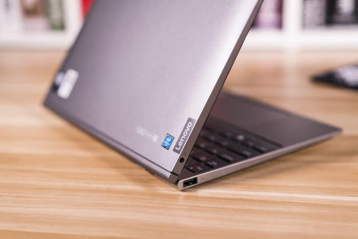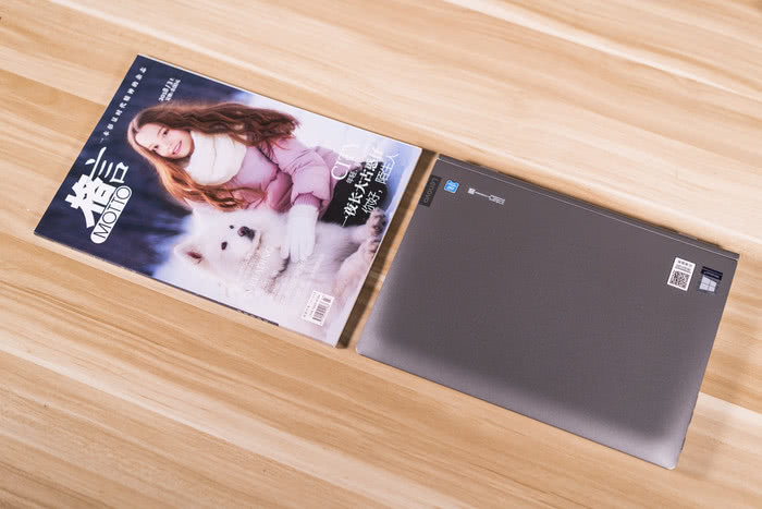 说体积小,很多人没有概念,我们随手找了一本杂志,和平板做了一个对比,这下清楚了吧,你也可以放在包里比划一下。A面贴纸比较多,不喜欢的可以全撕了,边角有一个Lenovo的LOGO,可选银金两色。由于搭载超低功耗处理器,采用无风扇散热结构,所以没有进出风口。