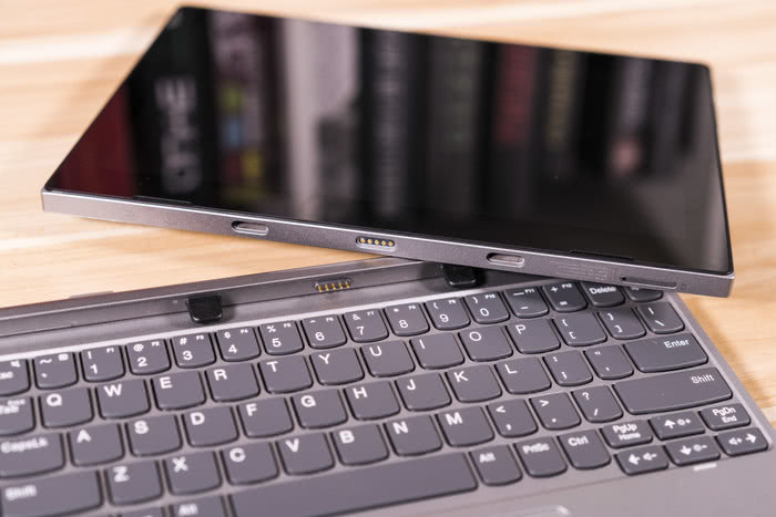 IdeaPad D330配有一个3.5mm耳机接口、一个MicroSDXC插口和一个type-C USB 3.1接口,在机身轻薄的前提下基本满足使用者的基本需求。接入键盘底座后,键盘左右两侧多出了两个USB接口,充分满足外接设备的需求,双U盘同时拷贝也是没问题的。