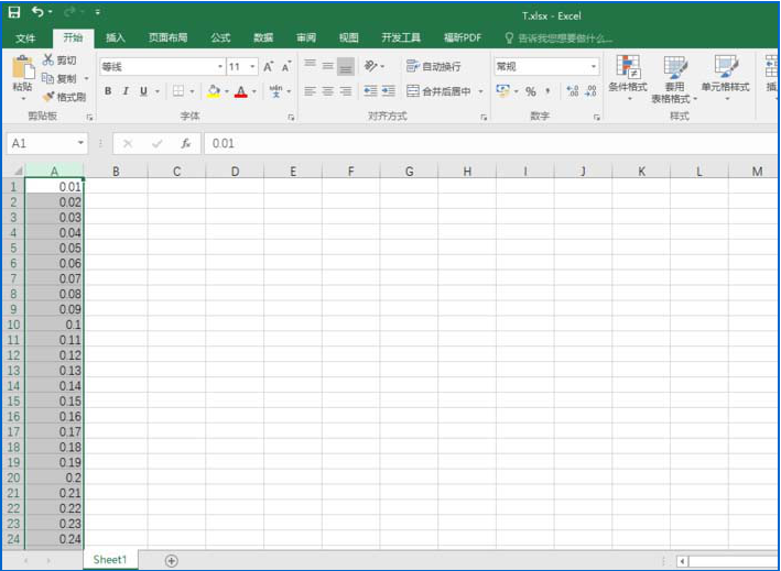 1、将Excel打开,在编辑栏中的A1单元格输入0.01并将A列选中。