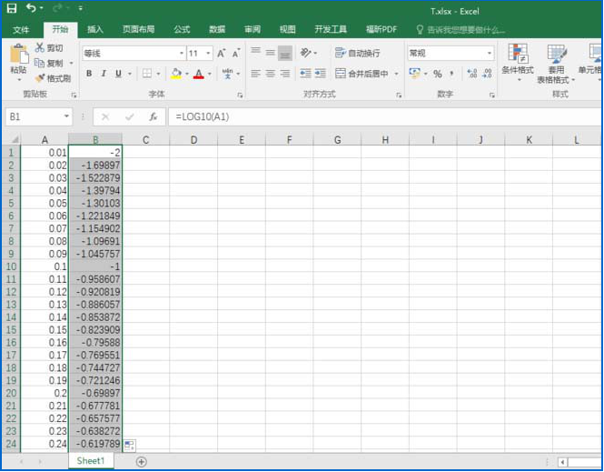 5、我们在B1单元格输入“=LOG10(A1)”,也就是求出以10为底的对数函数值。