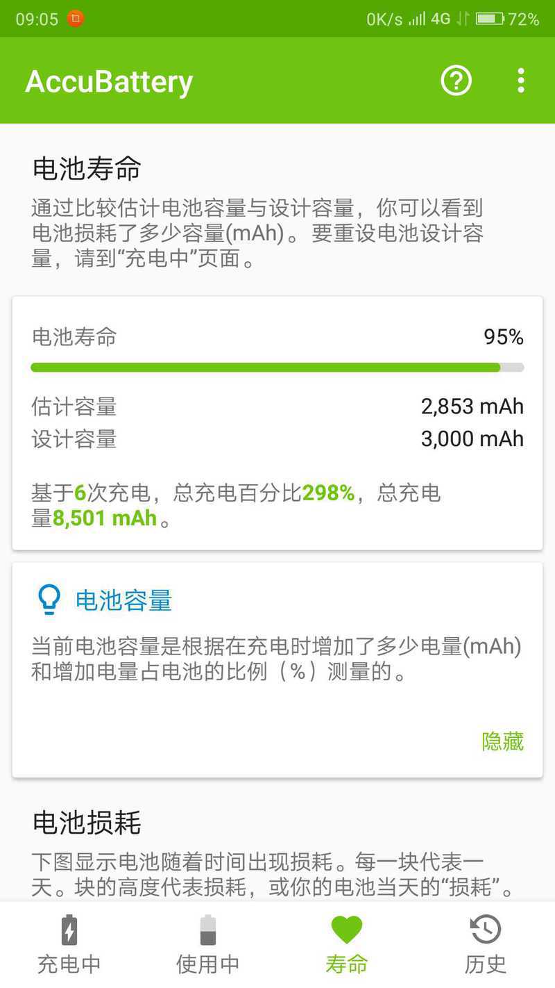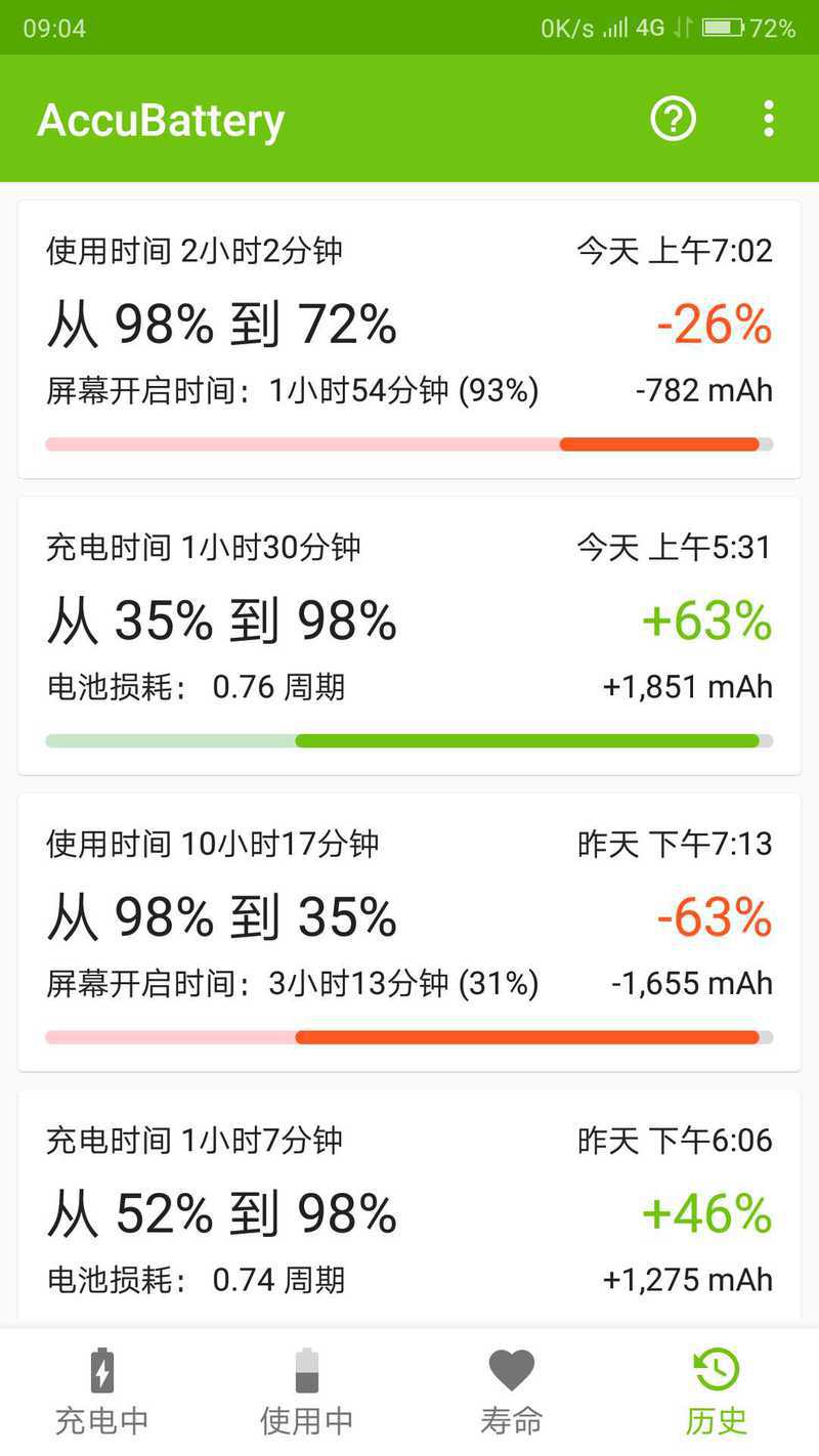 第一行可以看到,在我以上使用情况下,两个小时耗掉了26个电。我不知道别人都是什么情况,但对于我来说,这个耗电量很低,之前的旧电池,如果是相同的使用情况,起码耗电60个以上。