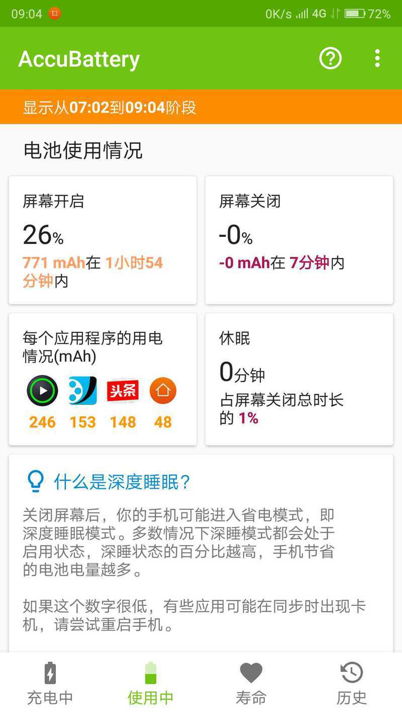 时间段细分,除去很少的屏幕关闭时间,在1小时54分钟的亮屏时间内,耗掉771毫安电量,程序耗电最多的依次是视频播放器、豆瓣电影、头条,和我测试使用软件情况一致。