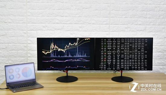 比如我们就搭建了一个金融白领的使用场景,用笔记本连接两台ThinkVision X1(2nd Gen)显示器,左边的显示器显示股票的走势图,右边的显示器显示股票的相关板块,笔记本显示相关行业的占比情况,两台显示器加上笔记本的屏幕可以让金融从业人士更方便地查看信息,进而提高工作效率,同时,两台ThinkVision X1(2nd Gen)显示器放在一起也可以实现无缝拼接,看起来更漂亮。