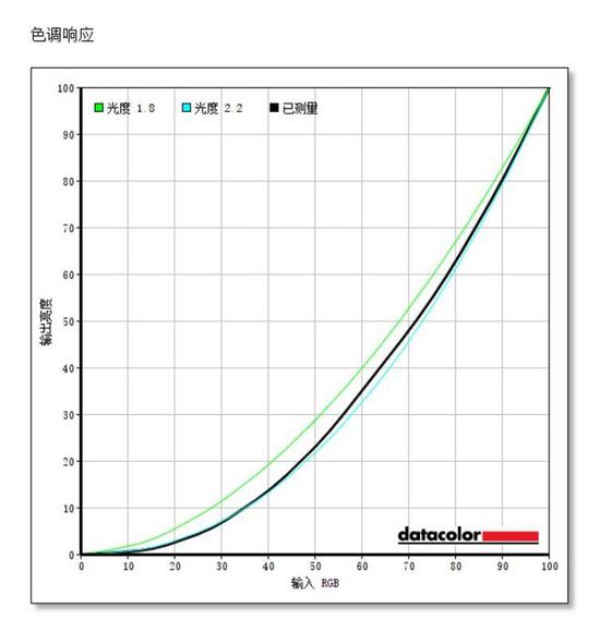 色调响应方面,已测量的黑色曲线应该尽量和“光度2.2”曲线保持一致,可以看到实测的黑色曲线和“光度2.2”曲线在20%-60%的亮度下有一定偏离。