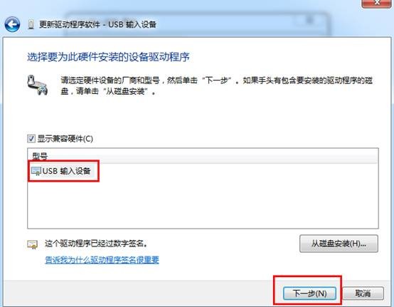 右键选择更新驱动程序---浏览计算机以查找驱动程序软件---从计算机的设备驱动程序列表中选择---选择USB输入设备---下一步问题解决。
