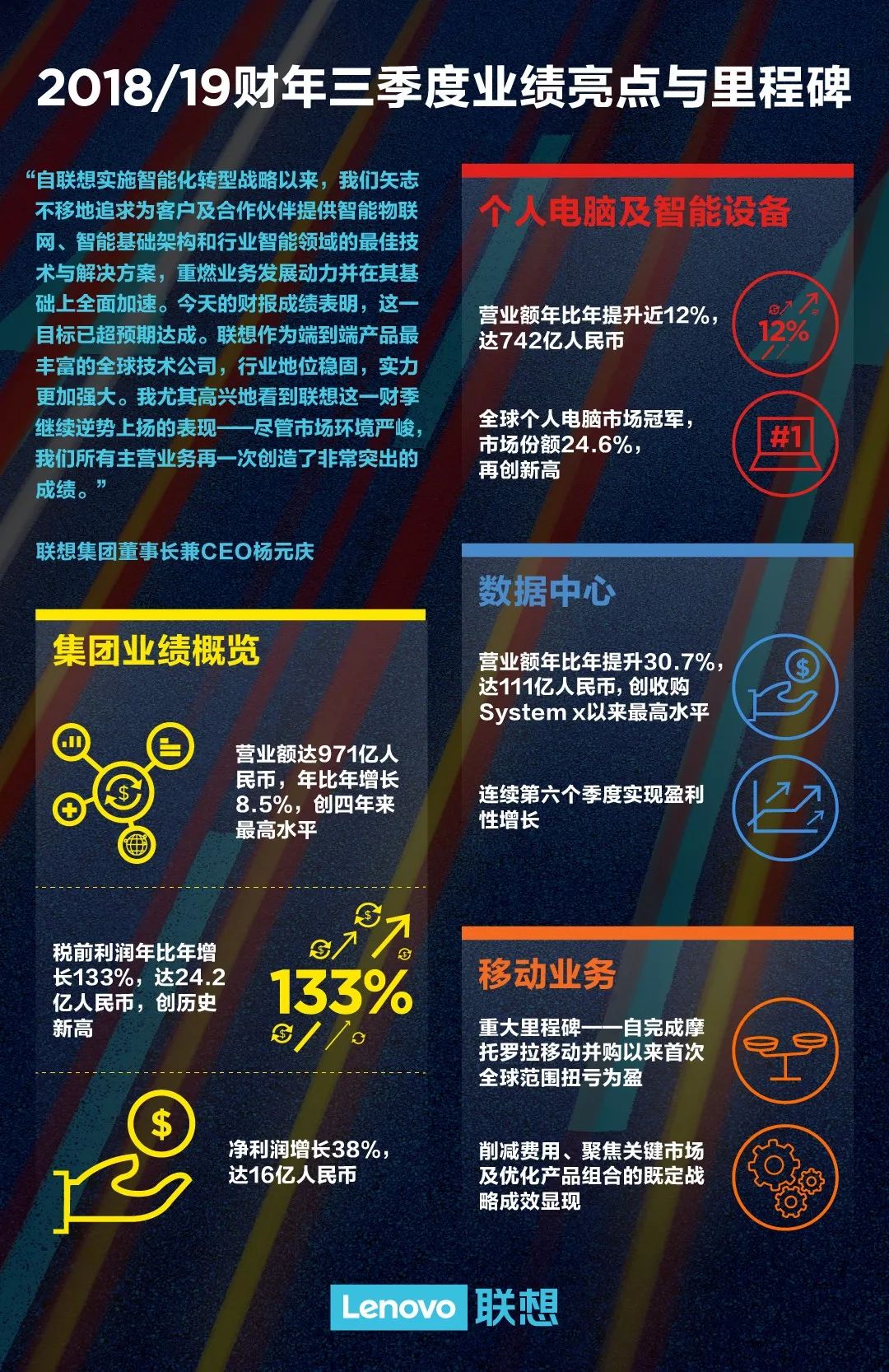 • 所有业务部门实现增长:个人电脑及智能设备业务、移动业务和数据中心业务均实现增长;
