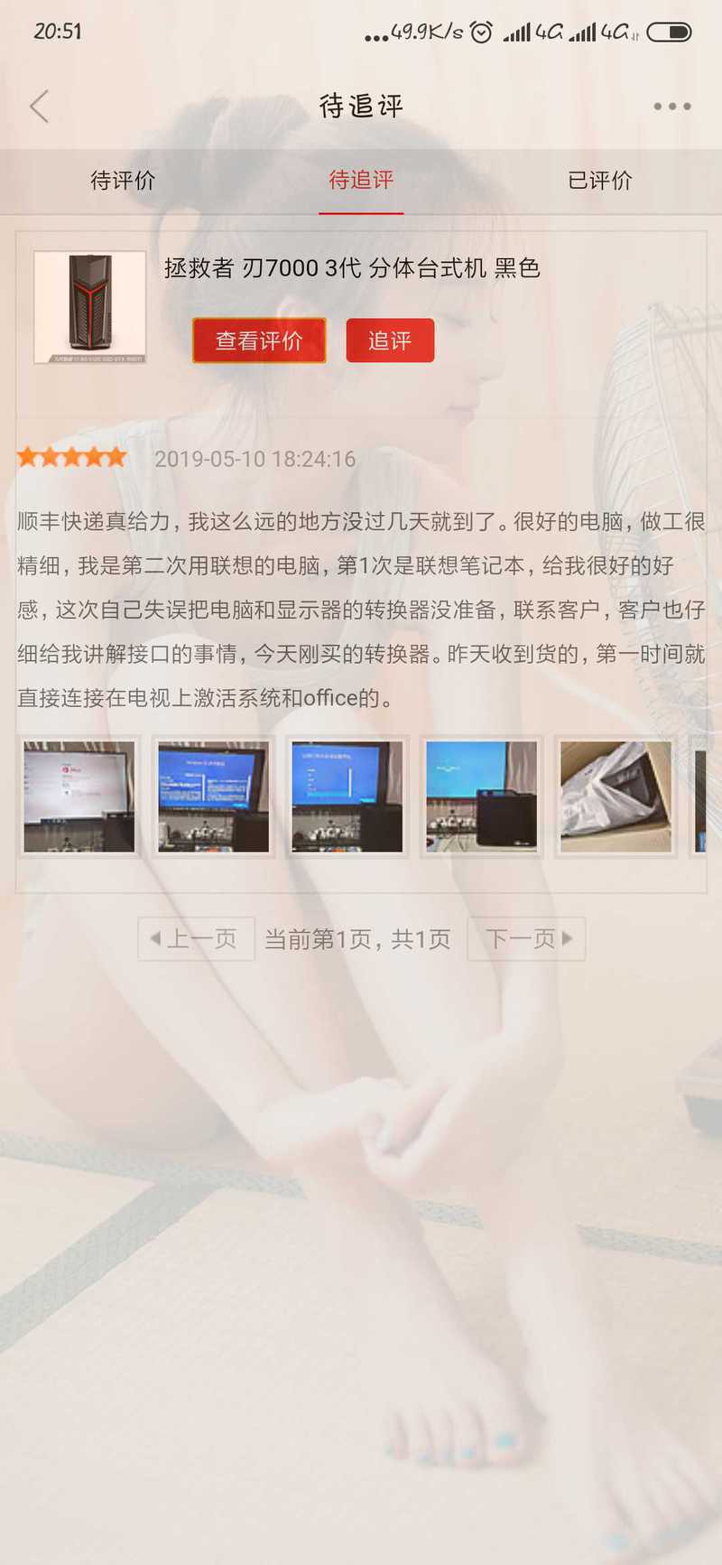 顺丰快递真给力,我这么远的地方没过几天就到了。很好的电脑,做工很精细,外观装饰灯飞车挺漂亮。特别是那个手提设计非常给力。我是第二次用联想的电脑,第1次是联想笔记本,给我很好的好感,这次自己失误把电脑和显示器的转换器没准备,联系客户,客户也仔细给我讲解接口的事情,今天刚买的转换器。昨天收到货的,第一时间就直接连接在电视上激活系统和office的。