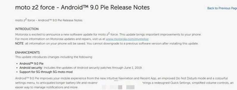 摩托罗拉官方放出 moto z2 force 的 Android 9.0 Pie 系统更新说明,更新后可通过 5G 模块支持 5G 网络。 |