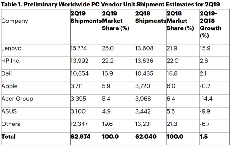 近日,研究机构Gartner公布,全球第二季个人电脑销量上升 1.5% 至 6300 万台,2018 年第二季度为 6200 万台,主要是受惠微软推出 Window 10 操作系统的更新,带动电脑换机需求增长。市场占有率方面,联想集团以 25% 排首位,惠普以 22.2% 排第二,第三位是戴尔占 16.9%;苹果占有率 5.9%。 Gartner 高级分析员 Mikako Kitagawa 表示,英特尔芯片的短缺情况有所改善,也是利好个人电脑销售的原因之一。 ![]() |