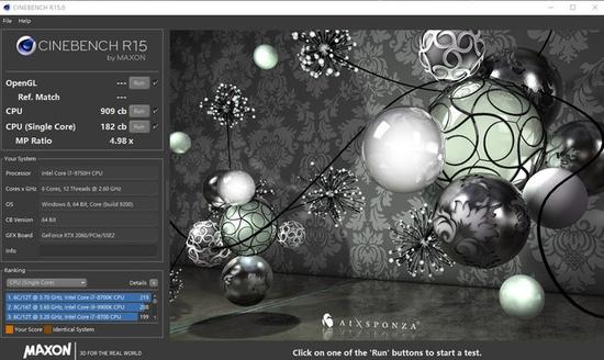 CineBench是很有说服力的一套CPU和显卡测试系统,测试包括针对处理器和显卡的性能指标。第一项测试纯粹使用CPU渲染一张高精度的3D场景画面,在单处理器单线程下只运行一次,如果系统有多个处理器核心或支持多线程,则第一次只使用一个线程,第二次运行使用全部处理器核心和线程。第二项测试则针对显卡的OpenGL性能。