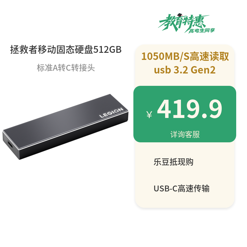 【高速传输】 联想拯救者移动固态硬盘512GSSD双接口