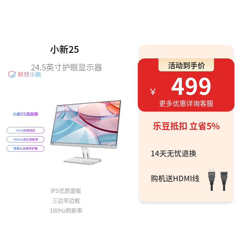 【时尚办公】联想小新25 24.5英寸FHD 100Hz高刷硬件护眼显示器