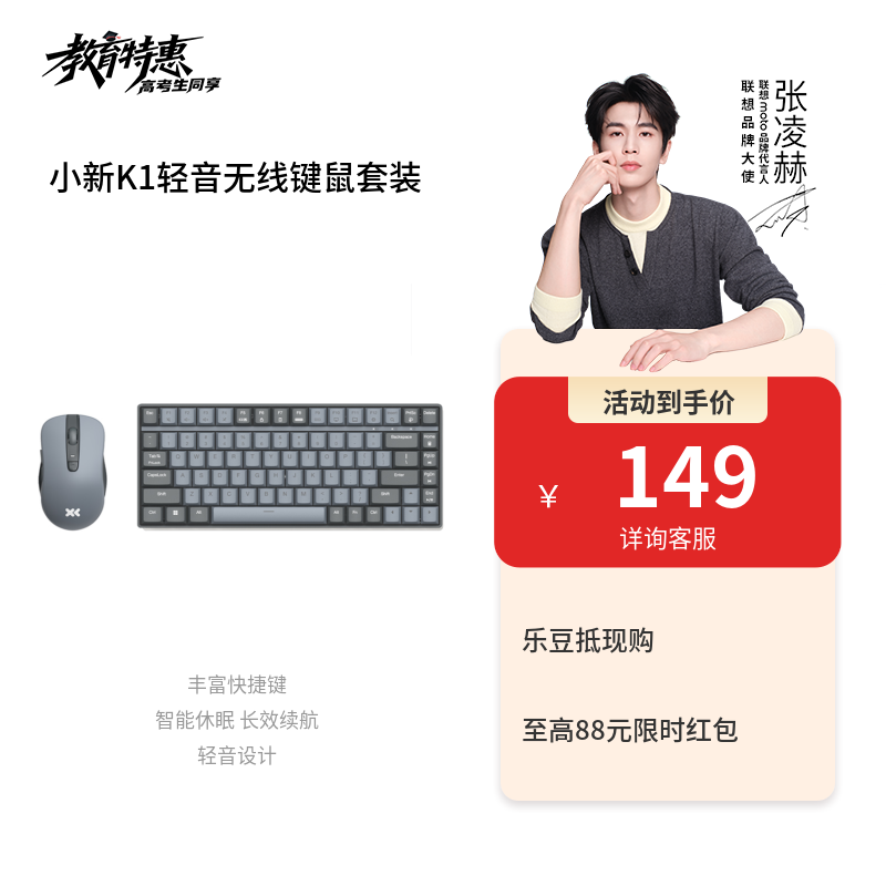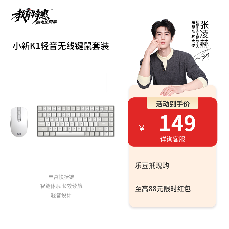 【双色键帽】联想小新 K1轻音无线键鼠套装月慕白84键盘+鼠标