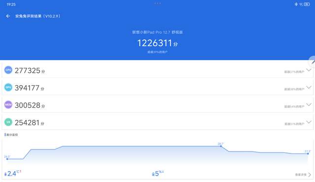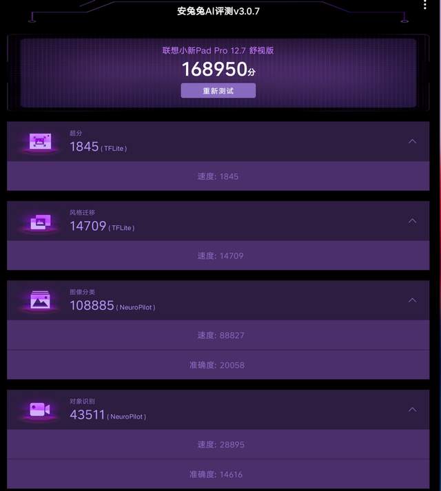 5188444 支持帧绮映画、HDR真彩,杜比视界、帧享影音 小新Pad Pro 12.7 舒视版这块屏幕拥有高达2.9K(2944*1840)高清分辨率,PPI达到273,拥有144Hz高刷新率,支持智能自动调节刷新率,DCI-P3广色域,16:10的黄金屏幕纵横比例,87%的屏幕占比,拥有10亿色彩,10bit色深,支持DC调光无频闪。哔哩哔哩、优酷和爱奇艺都已经适配支持帧绮映画、HDR真彩,杜比视界、帧享影音的画质。试看了一段爱奇艺帧绮映画,4K画质确实相当清晰,有杜比全景声加持,音质也特别好,堪称视觉盛宴。 ![]() 纸感手写体验: 小新Pad Pro 12.7 舒视版拥有舒适的护眼屏幕,拿到手后自然想试试它的手写效果。爱好画画的小朋友用自带的第三方APP画世界Pro画了一幅画,对整个画图体验,她是赞不绝口,无论是手写笔还是这块屏幕都相当舒适。同样在第三方APP享做笔记里面体验了手写,笔迹的延迟相当,笔锋、下笔轻重都能挥洒自如,有无限接近原生纸感的体验。 ![]() 屏幕亮度/色域测试(仅供参考) 小新Pad Pro 12.7 舒视版的屏幕支持饱和度和色温调节,也就是可以在鲜艳(DCI-P3广色域)和标准(sRGB色域)之间切换,并且还能切换标准色域和冷暖色温,更方便的是可以点击中间的色温圆球,自定义自己喜欢的屏幕色温。 ![]() 看到屏幕,习惯性的想测试一下屏幕亮度和色域。但在笔记本电脑上所用的DisplayCAL配合红蜘蛛的测试方法,在安卓平板电脑上无法使用,因为软件没有适配安卓设备。但联想小新Pad Pro支持联想超级互联,因此想了一个办法,借助联想超级互联,使平板和电脑同屏,以这样的方式来对这块屏幕进行测试,因为是同屏的,平板只是同笔记本的屏幕变化,亮度测试结果与实际肯定有误差,而且没有这款平板电脑屏幕的校色文件,因此测试结果只可以作为参考。在鲜艳模式下,屏幕亮度典型值约为380尼特。真实的屏幕亮度肯定要更高。 ![]() 屏幕色域覆盖约为100%sRGB和100%DCI P3色域。容积100%PCI-P3色域和98%AdobeRGB色域,更是达到140%sRGB色域。同样,这个值只作为参考,因为没有较色文件,与真实色域肯定有差距。但能说明的是,小新Pad Pro 12.7 二代这块舒视屏的色彩显示是足够好的。 ![]() 天玑8300加持,兼顾性能与能效 小新Pad Pro 12.7 舒视版搭载联发科天玑8300处理器。这是一颗兼顾高性能与高能效的处理器。采用台积电第二代 4nm工艺制程,基于 Armv9 CPU 架构,八核CPU 包含 4 个 Cortex-A715 性能核心和 4 个 Cortex-A510 能效核心,CPU 峰值性能较上一代提升 20%,功耗节省 30%。话不多说,直接看跑分。在安兔兔中的综合跑分成绩高达1226311分。 ![]() Geekbench6的CPU多核成绩为4509分,CPU单核成绩为1415分,GPU综合跑分7973分。 ![]() ![]() 整体来说,这颗处理器的性能并非顶级,但足够日常使用。同时它拥有超高的能效比,可以充分兼顾日常使用、游戏娱乐、办公、学习等。同时其AI性能也不错,安兔兔AI评测综合得分168950,还是相当高的。 ![]() LPDDR5X内存、UFS4.0高速存储 小新Pad Pro 12.7 舒视版除了搭载了高性能高能效的处理器,还搭配了LPDDR5X内存、UFS4.0高速存储,这是真旗舰机的搭配组合。手中这台小新Pad Pro 12.7 提供了256GB的存储空间。经过实测,它顺序读取速度为4128MB/s,顺序写入速度为3188MB/s,综合得分高达189438分。这样的读写速度可以让平板的硬件性能得到更好地发挥,日常使用速度更快,更流畅,更稳定。 ![]() 游戏体验: 为了可以更加直观地了解小新Pad Pro 12.7 舒视版的性能,测试了《原神》《王者荣耀》《和平精英》《金铲铲之战》这些比较主流的热门游戏,都是可以流畅运行的。毕竟有天玑8300处理器、LPDDR5X内存、UFS4.0高速存储这组黄金组合。作为12.7英寸大屏幕,在玩金铲铲之战的时候,优势就相当明显,大屏幕可以显示相当多的内容,画质也很清晰。再看用手机打金铲铲之战时的显示画面,明显要少很多。大屏大视野正是小新Pad Pro 12.7。 ![]() ![]() 45W快充,超长续航 小新Pad Pro 12.7舒视版内置了一块10200mAh的超大容量电池,并提供45W的快速充电,随机附送有45W充电头。实测从电池电量耗尽关机状态,也就是0%充电至50%用时38分钟,一小时充电77%,充电至100%共用时87分钟,速度相当快。 ![]() 充满电后,紧接着测试了一轮使用续航。方法很简单粗暴,并没用什么测试软件,而是循环播放一段4K高清HDR的视频,屏幕亮度设置为100%,这种测试方法是高强度的,只是证明续航能力,并非日常使用续航。因为日常使用,亮度设置到50%就足够了,4K高清视频也是比较费电的。最终从100%到0%自动关机,整整用时11小时12分钟。以此来看,平时正常使用,充满一次电,使用两天是完全够的。 ![]() ZUI16智能体验: 小新Pad Pro 12.7舒视版搭载基于安卓14的ZUI16操作系统。经过不断的更新迭代,ZUI系统的功能已经相当丰富实用了。支持联想超级互联、联想超级文件、一视界,平行视窗、应用浮窗、自由分屏,分屏的大小可以自由拖动,相当实用,还支持AI实时字幕、视频通话助手等功能。还内置有联想小天AI 智能体。联想超级文件是不仅是一个文件管理器,它还是一个支持跨设备、跨平台相互访问管理的智能应用。比如可以在电脑上可以查看平板电脑和手机上的文件,并进行管理,也可以将文件下载到本地。比较重要的是,联想超级文件没有品牌限制。 ![]() ZUI系统还有一个特色是应用分身,ZUI系统支持所有APP的应用分身,并且可以分身多达五个,这是其它品牌的系统所不具备的功能。 ![]() 联想小天AI智能体: 2
