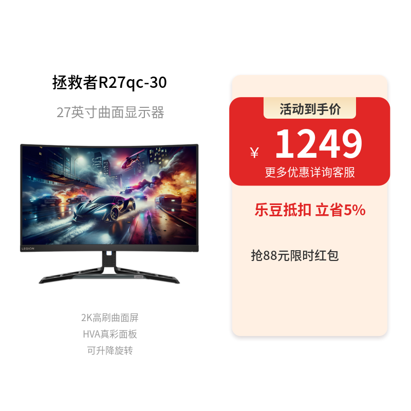 【主流游戏】联想拯救者R27qc-30 27英寸2K 180Hz可升降旋转曲面显示器