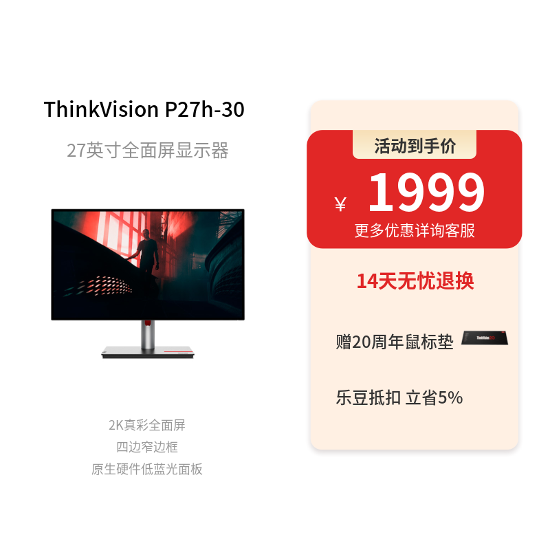 我挑选的是联想/ThinkVision 27英寸显示器 P27h-30,这款显示器专业2k真彩全面屏,27寸极窄边框,外加防蓝光,超护眼,还有满血的typc-c接口,特别好,专业而不失典范,双十一优惠价格1919元,原价1999元。 |
