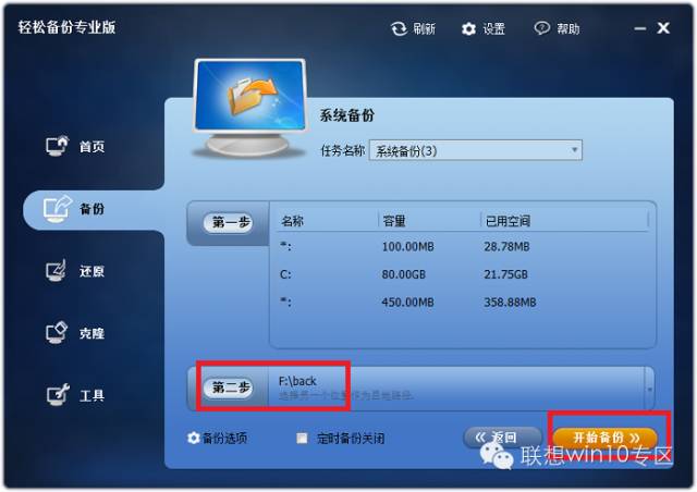 3.选择自己一个专有的地址,点击 “开始备份”,这里软件默认备份磁盘的第一系统自动产生的备份分区和第三启动引导分区、第四系统安装分区。第二个隐藏的记录磁盘分区表的分区是不能被读取的。