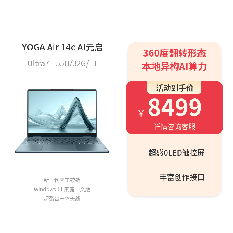 联想 YOGA Air 14c AI元启 14英寸轻薄360°翻转笔记本 雾海蓝