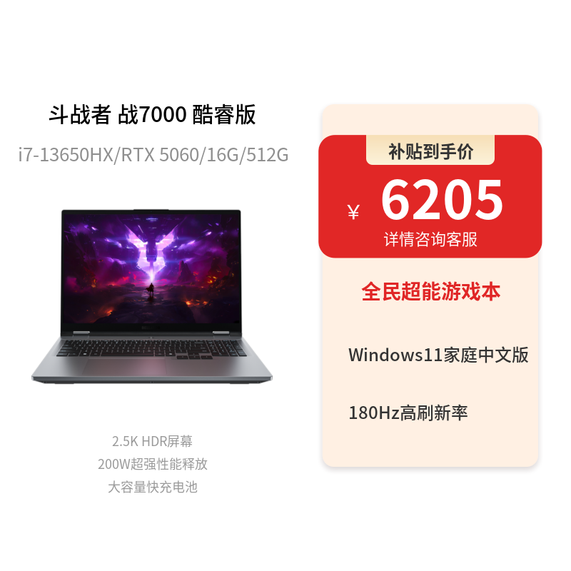 来酷(Lecoo)斗战者 战7000 2025 16英寸电竞游戏本笔记本月光灰