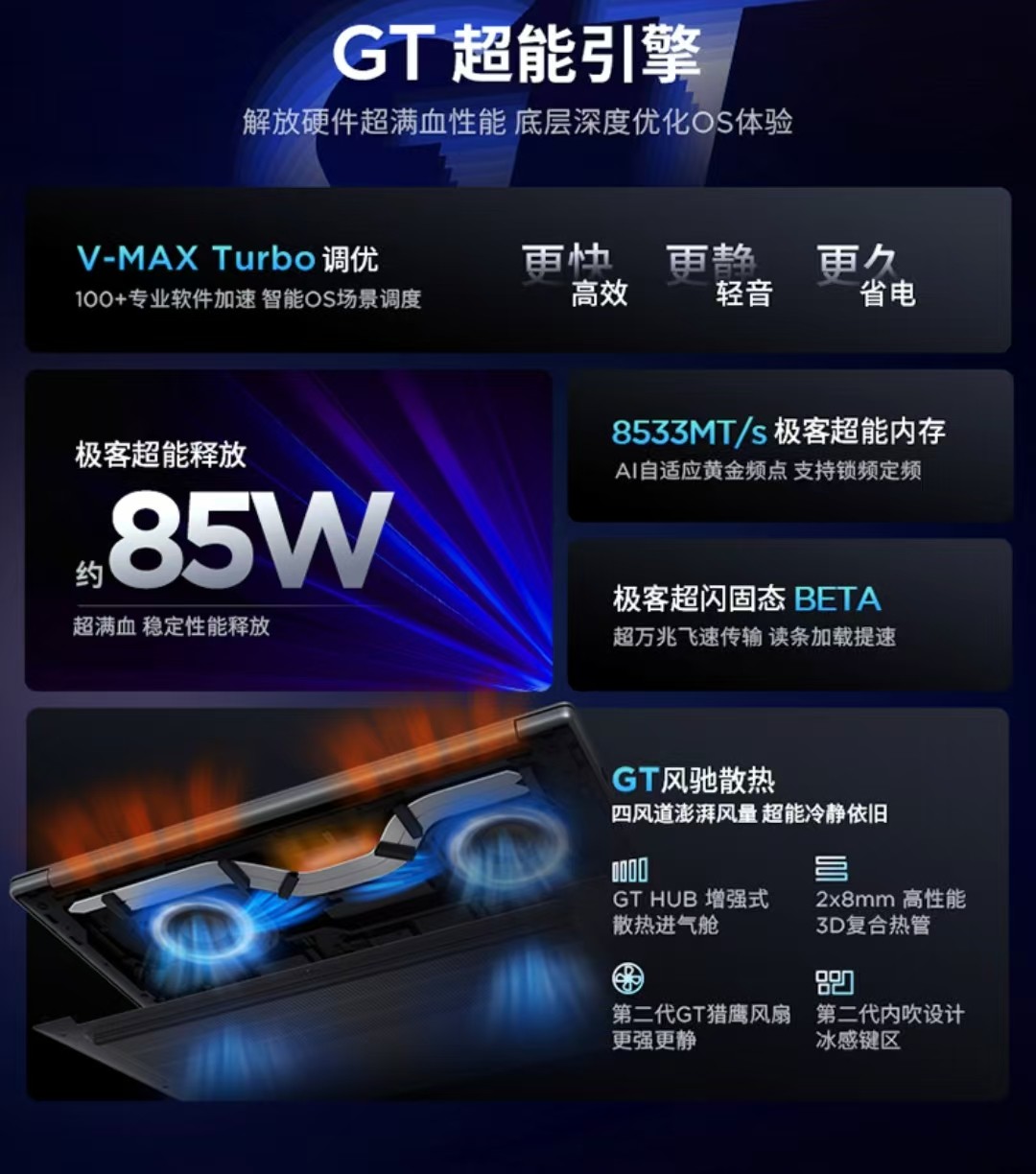 - 处理器:酷睿版搭载英特尔酷睿Ultra 9 285H等处理器;锐龙版搭载锐龙AI 9 H365(Zen5架构,8核16线程,最高睿频5.2GHz)等处理器。