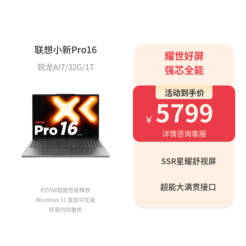 书归正传,首选联想小新Pro16 GT AI元启版 是2025年联想推出的高性能轻薄笔记本,搭载最新处理器和顶级OLED屏幕,主打"轻薄+性能"的平衡体验。