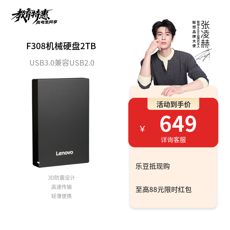 【高速传输】联想USB3.0移动硬盘F308机械硬盘轻薄便携稳定黑2TB