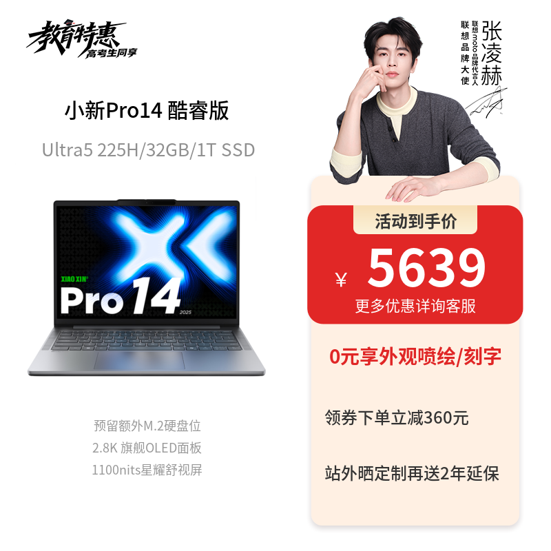 小新 Pro 14 2025:搭载全新英特尔酷睿2代Ultra5 225H处理器,最高睿频4.9GHz,配备32GB DDR5内存和1TB PCIe 4.0 SSD,性能强劲。2.8K OLED HDR1000屏幕,120Hz刷新率,护眼舒适,适合办公与创作。机身轻至1.5kg,便携性佳,价格5699元,性价比突出。