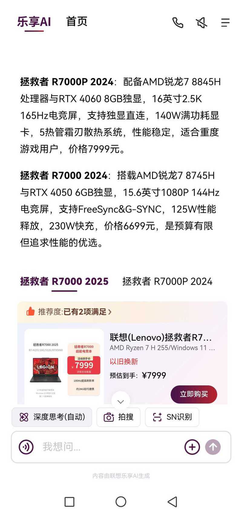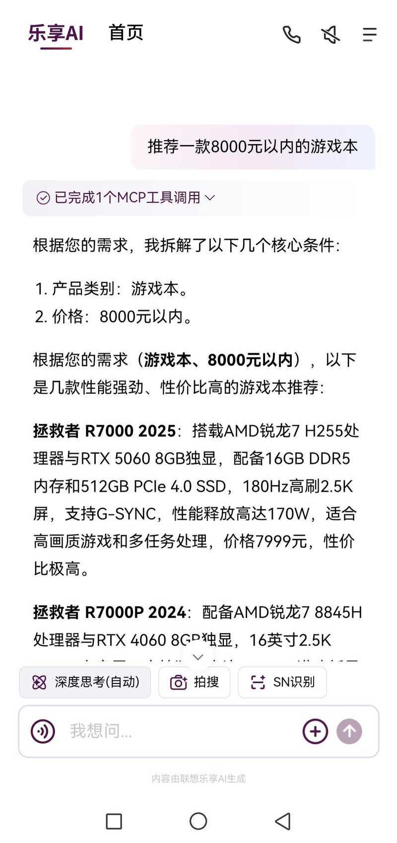 试了一下联想的AI,让他推荐一下笔记本电脑,感觉回答让我挺满意的。 |