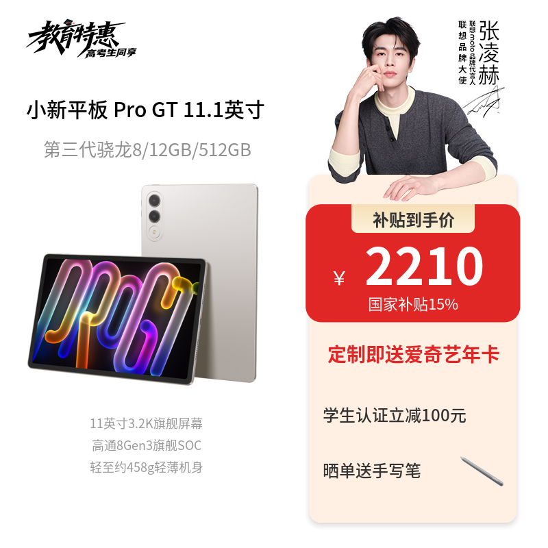 第二件神器当然是平板了,推荐张凌赫同款联想小新平板 Pro GT 11.1英寸学习影音办公 AI平板电脑12G+512G WIFI 浅海贝(2599元)