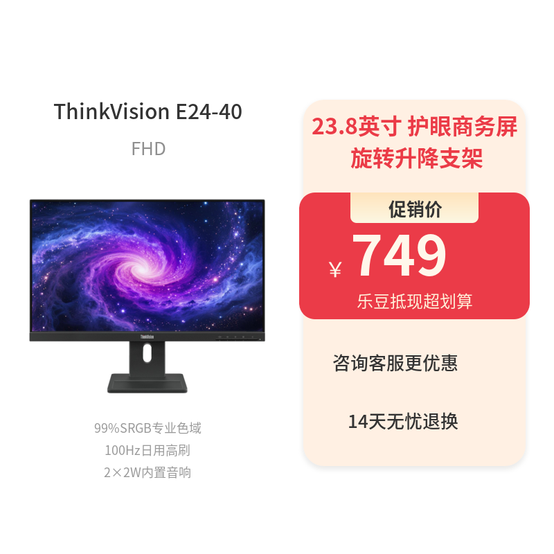 【进阶办公】联想ThinkVision E24-40 23.8英寸FHD 100Hz 内置音箱护眼显示器
