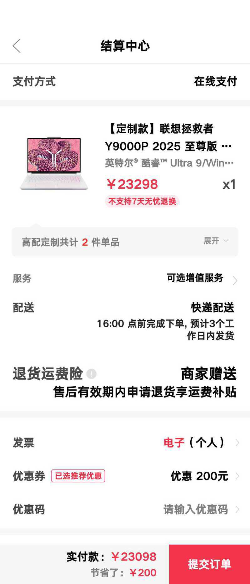 1.必须给全家安排超级能打的联想拯救者Y9000P 2025至尊版 16英寸,所有3A大作通吃,其他办公软件自然不在话下,轻松把握,悄悄的和你们说这个是给自己准备。。。现在下单还优惠200大洋。23098元