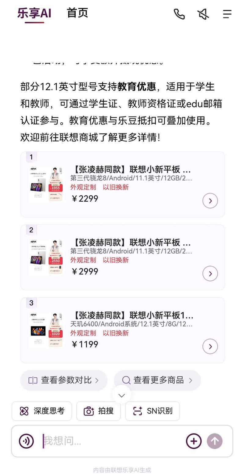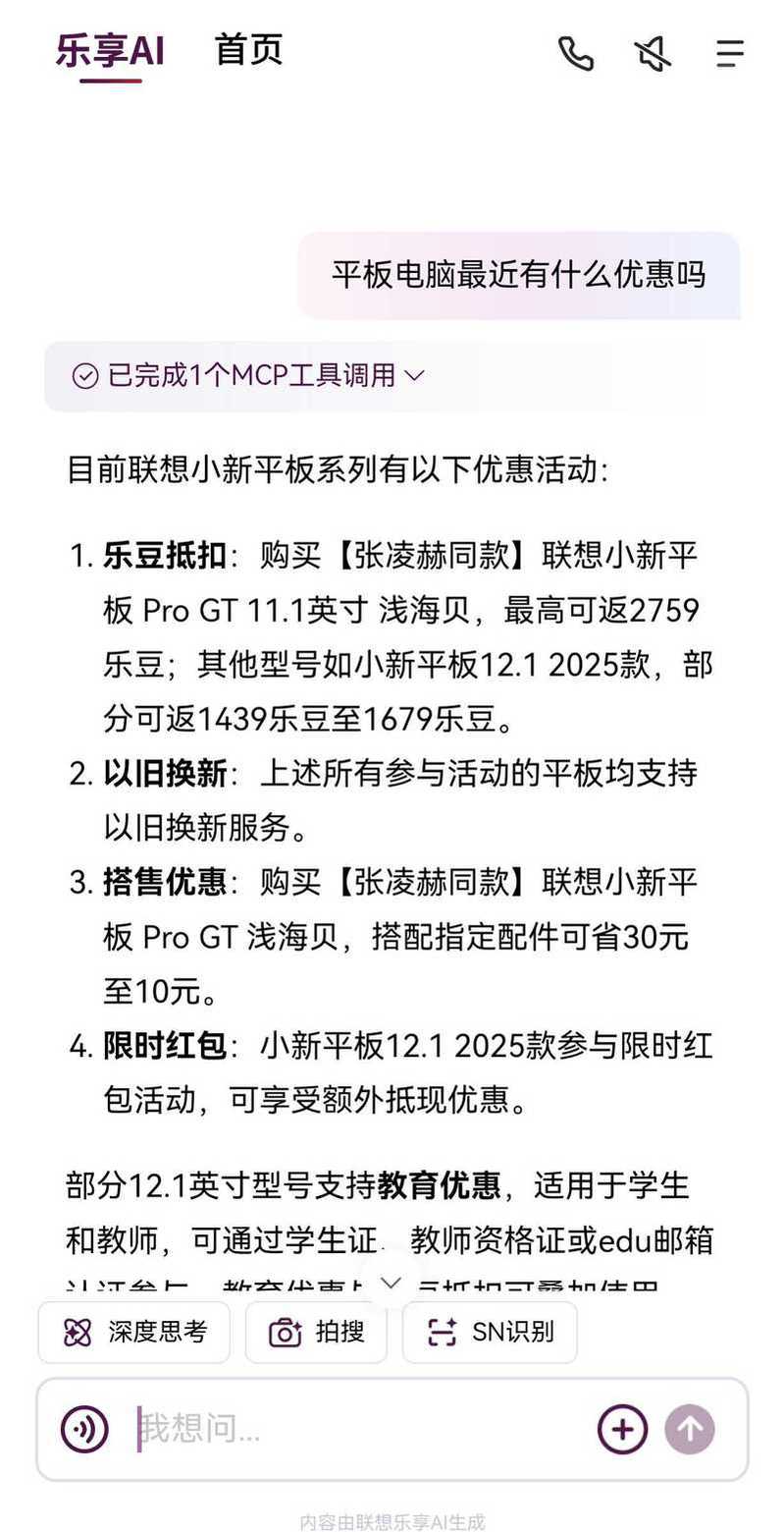 今天是用AI问了一下,最近有没有平板电脑的优惠活动,他告诉我最近有乐豆抵扣,以旧换新,还有限时红包。是我想要的回答。 |