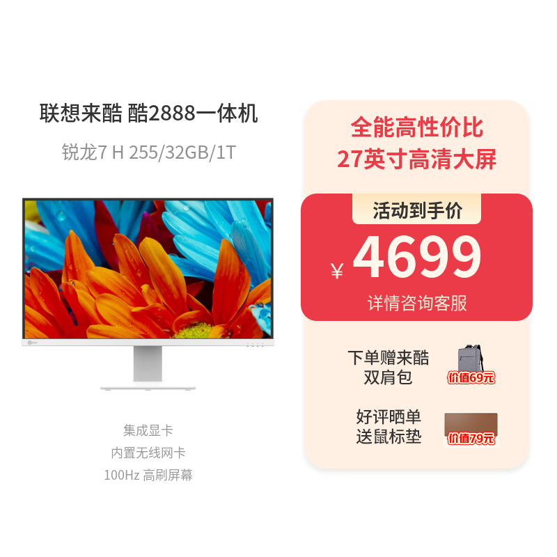 联想一体计算机 来酷 酷2888 锐龙7 H 255 27英寸一体台式机 白色