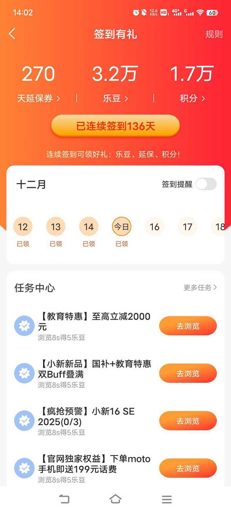 APP已经是最新版本,显示已经签到,但实际并没有(而且对应的延保卡、乐豆、积分奖励都没有)。 |