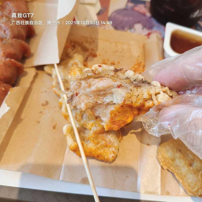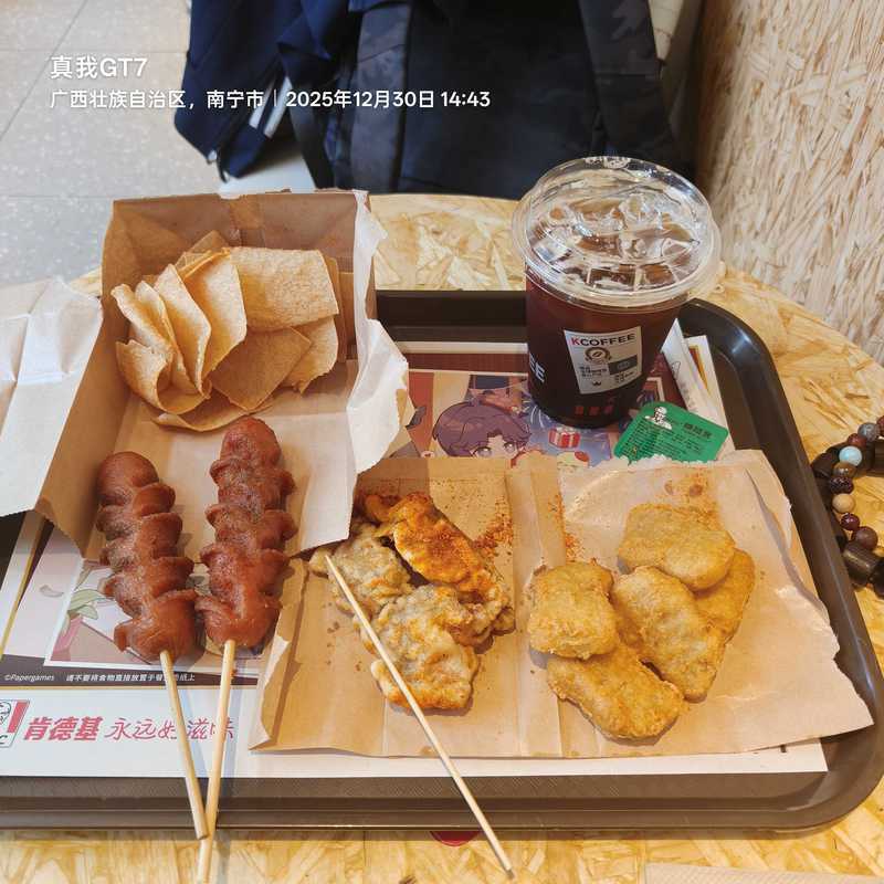中餐不吃正餐了,光靠小吃了,正新烤肠¥4.99+有民炸鸡肉二块和薯片¥3.5+肯德基冰美式五块鸡块¥10
